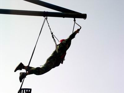 從某種意義上說,空中抓杠環(huán)節(jié)可以說是對參訓(xùn)隊員勇氣、膽量和自信的挑戰(zhàn),因為面對超出自己掌控能力之外的事物,最大的困難不是來自外界的壓力,而是滋生于內(nèi)心深處的本能恐懼。所以,盡管整個作業(yè)過程都采取了周密的安全防范措施,但還是能感覺到大家內(nèi)心的不平靜。短暫的調(diào)整之后,有人勇敢地跨出了艱難的第一步,之后的經(jīng)歷證明事情似乎并沒有想象中的那么難。正如俗話所說的那樣,給自己以足夠的信心和勇氣就沒有完不成的任務(wù),誰說不是呢?